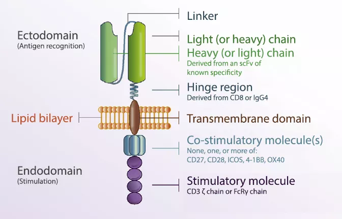 首先, 讓我們簡單回顧下CAR-T療法的作用機制, CAR(嵌合抗原受體)是一種基因工程技術(shù)制造的人工受體分子,它可以賦予免疫效應細胞(如T淋巴細胞)針對某個靶點抗原表位的特異性,從而增強T淋巴細胞識別抗原信號與活化的功能,繼而回輸淋巴細胞以實現(xiàn)抗腫瘤的作用。