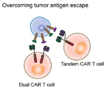 而所謂的多靶點CAR-T細胞,主要是設(shè)計用于靶向不同的腫瘤抗原,包括具有兩個CAR的雙CAR-T細胞或具有多個單鏈抗體(scFv)的串聯(lián)CAR-T細胞。這種多靶點CAR-T, 理論上能夠克服腫瘤抗原異質(zhì)性與腫瘤抗原逃逸